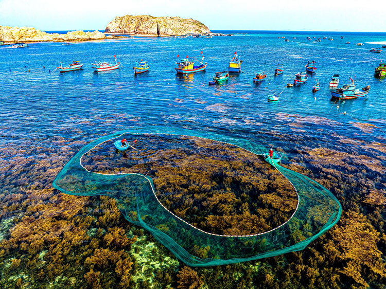 Rong mơ tại làng chài xã Nhơn Hải (thành phố Quy Nhơn, tỉnh Bình Định) phát triển tạo điều kiện thuận lợi cho các loài thủy sản sinh sống, góp phần đa dạng hệ sinh thái biển. Ảnh: Nguyễn Phan Dũng Nhân